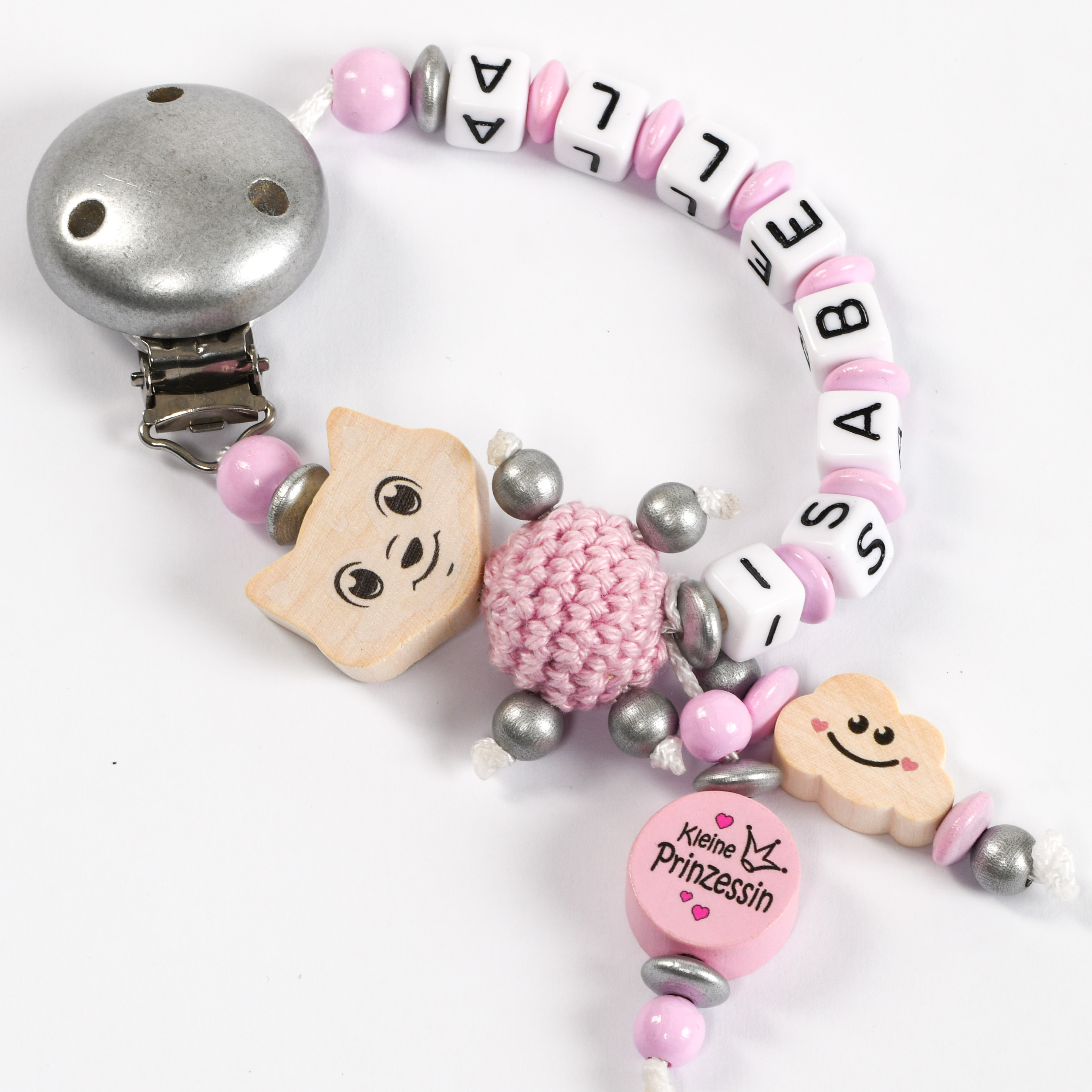 mit max. 8 Buchstaben, Schnullerkette in rosa-silber-natur mit Fuchs & Wendescheibe "kleine Prinzessin" & kleine Wolke