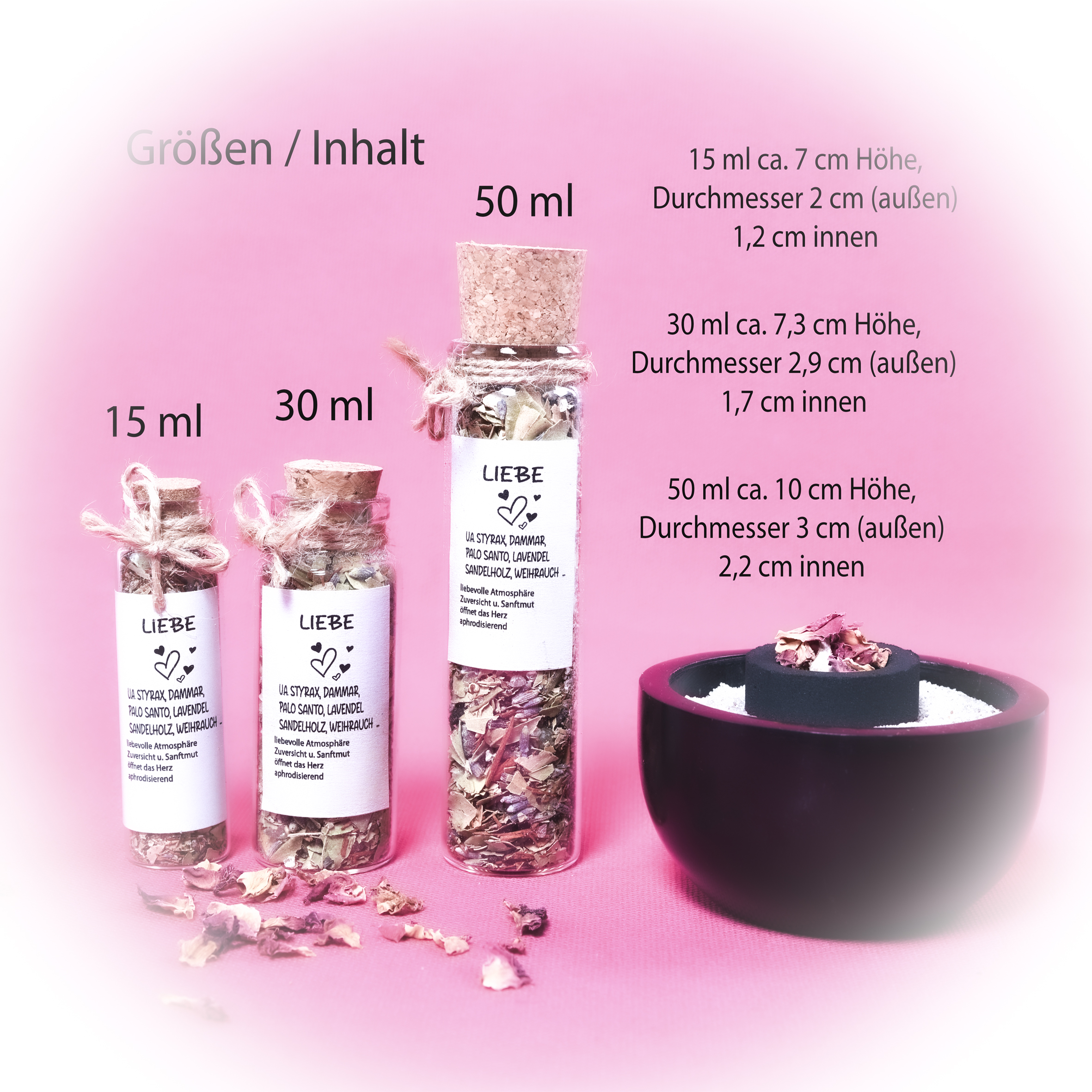 klein: 15 ml, Glasgröße Höhe ca. 7 cm, Durchmesser 2 cm (außen)
