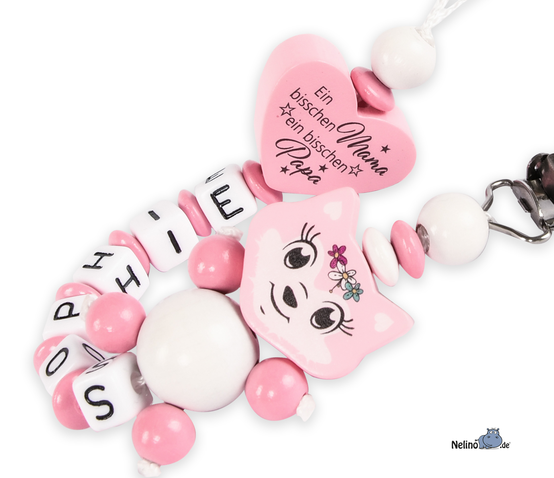 Diese Schnullerkette wird mit Ihrem Wunschnamen in liebevoller Handarbeit speziell für Sie hergestellt.