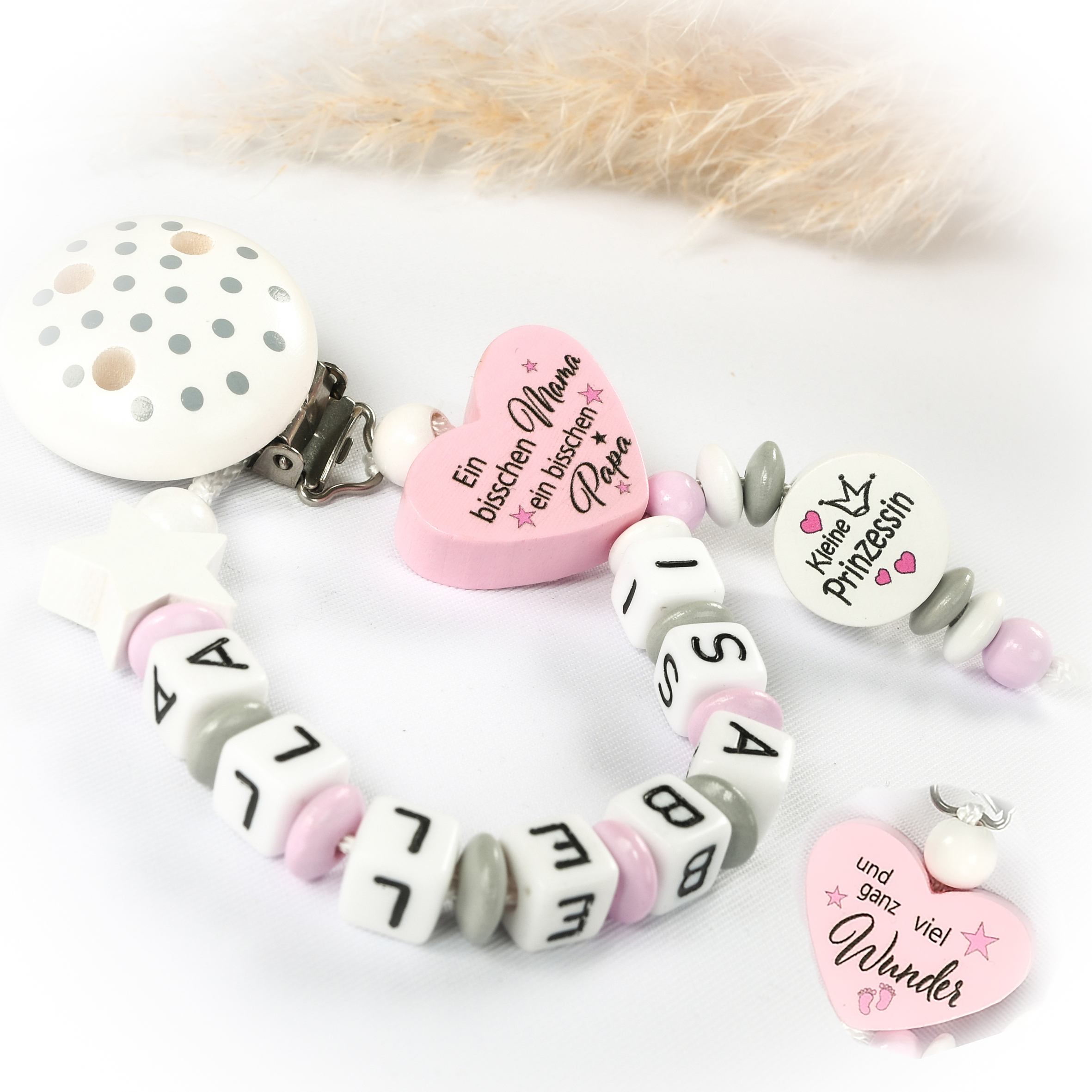 Diese Schnullerkette wird mit Ihrem Wunschnamen in liebevoller Handarbeit speziell für Sie hergestellt.