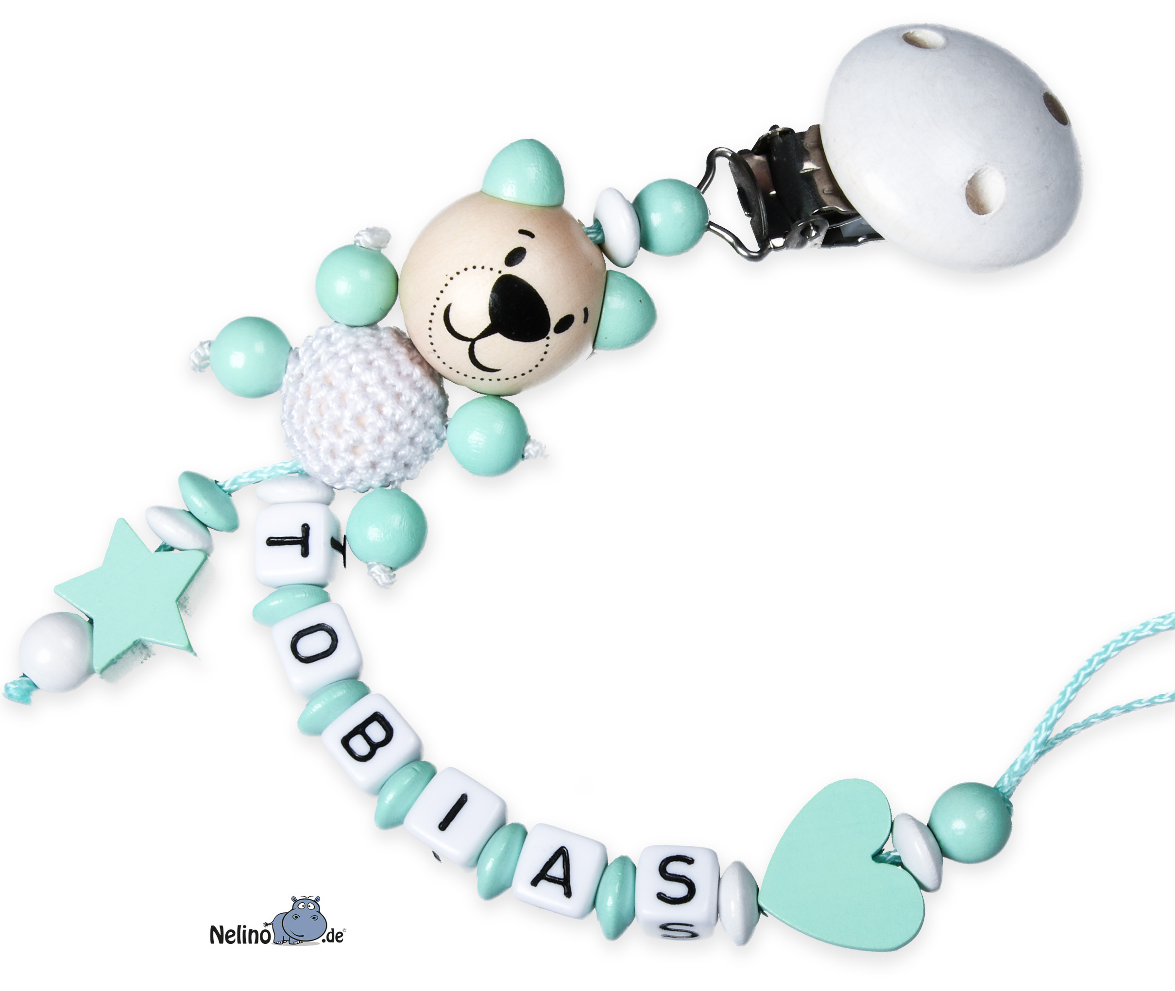 Diese Schnullerkette wird mit Ihrem Wunschnamen in liebevoller Handarbeit speziell für Sie hergestellt.